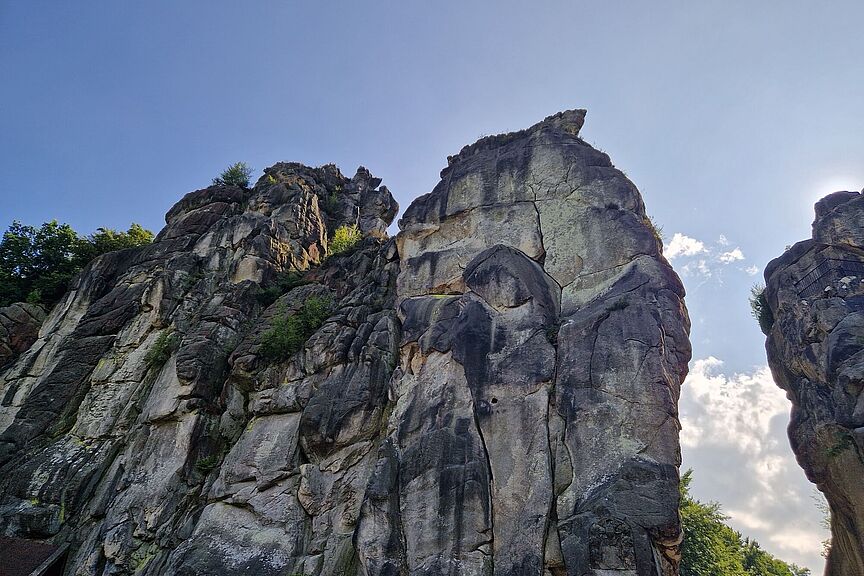 Die Tour führte weiter über Maspe nach Bad Meinberg. Es ging über traumhafte Waldwege vorbei an Feldern und Wiesen quer durch die herrliche Lipper Landschaft. Nicht umsonst wird das KfZ-Zeichen LIP mit „Living in Paradise“ übersetzt. Am frühen Nachmittag war das Ziel nach einem kurzen allerletzten Anstieg erreicht: Die Externsteine standen vor uns zum Greifen nah. Sie sind eine markante, rund 40 m hohe Sandstein-Felsformation im Teutoburger Wald und als solche eine herausragende Natursehenswürdigkeit Deutschlands, die unter Natur- und Kulturdenkmalschutz steht. Die Felsen sind vom Wiembecketeich und von einer parkartigen Anlage umgeben. Die Radfahr-Gruppe bestaunte die Felsformationen und weiter ging es Richtung Horn/Bad Meinberg, - Kaffee, Kuchen und Eis standen auf dem Programm: „Gelateria Bistro Michelangelo“ war der nächste kulinarische Halt. Um die Erhebung „Bellenberg“ am Rande des Teutoburger Waldes gelegen führte der Weg durch landschaftlich zauberhafte Gegenden – auch mal auf steilen Schotterpisten, aber das gehört dazu - nach Steinheim zum Bahnhof. Die intuitive Bedienerführung an Fahrkartenautomaten ist für manchen Bahnkunden/-kundin ein „Brief mit 7 Siegeln“! Nach einer etwas konfusen Aktion an einem solchen Automaten landete die Gruppe gesund und munter gemeinsam am Hamelner Bahnhof. Man glaubt es kaum, der Zug war pünktlich und alle Räder fanden Platz. Ein harter Kern von vier Radelnden lies die spannende und erlebnisreiche Tour auf dem Hamelner Werder genussvoll ausklingen.