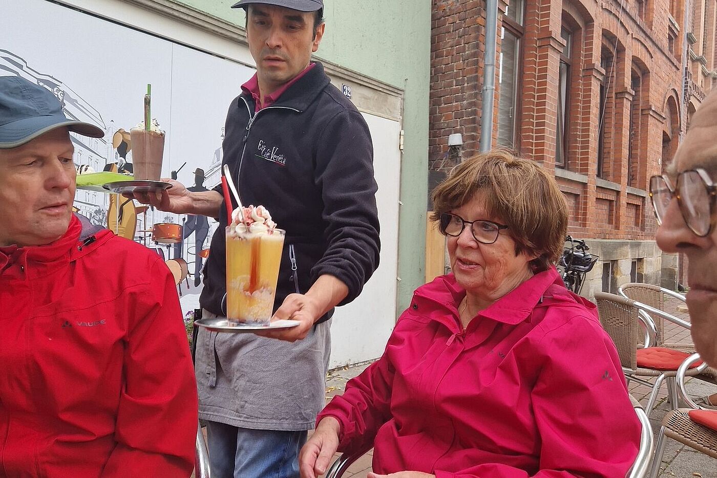 Dennoch war es eine gelungene Tour, - vor allem das Buffet mit Puten-/Schweineschnitzel, Gemüsebratlinge für Vegetarier, Bratkartoffeln und fruchtigem Salat. Die Variante für die Vegetarierfand sogar bei den Skeptikern der Fleischfraktion großen Zuspruch. Zurück führte der Weg mit einem Abstecher in der Eisdiele in Hessisch Oldendorf. Hier wurden bei herrlichstem Wetter und bester Stimmung Eis und andere Köstlichkeiten genossen. Fischbeck wurde als vorletztes Ziel angesteuert, und über den neu angelegten Radweg im Anschluss an das Upnor-Gelände fand diese Tour ihr Ende.