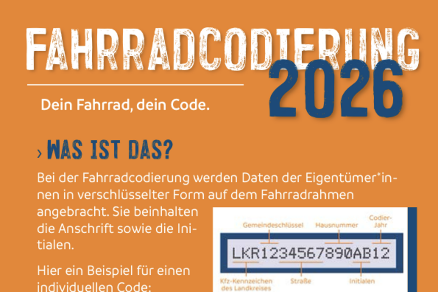 Bei der Fahrradcodierung werden Daten der Eigentümer*innen in verschlüsselter Form auf dem Fahrradrahmen angebracht. Sie beinhalten die Anschrift sowie die Initialen.